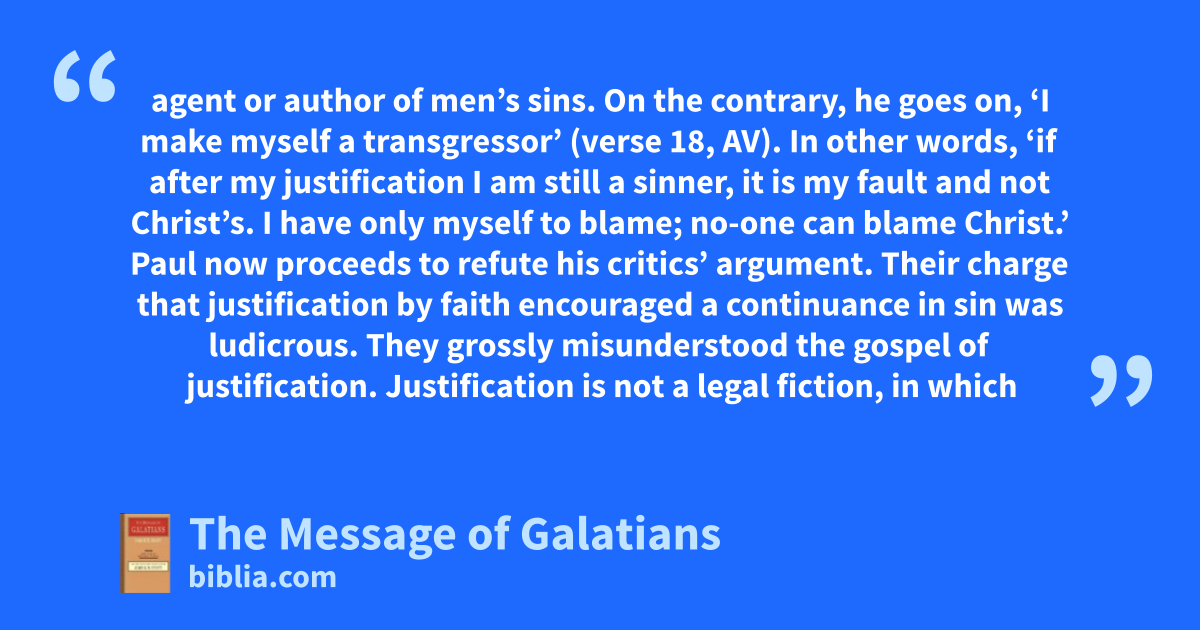 agent or author of men’s sins. On the contrary, he goes on, ‘I make myself a transgressor’ (verse 18, AV). In other words, ‘if after my justification I am still a sinner, it is my fault and not Christ’s. I have only myself to blame; no-one can blame Christ.’ Paul now proceeds to refute his critics’ argument. Their charge that justification by faith encouraged a continuance in sin was ludicrous. They grossly misunderstood the gospel of justification. Justification is not a legal fiction, in which