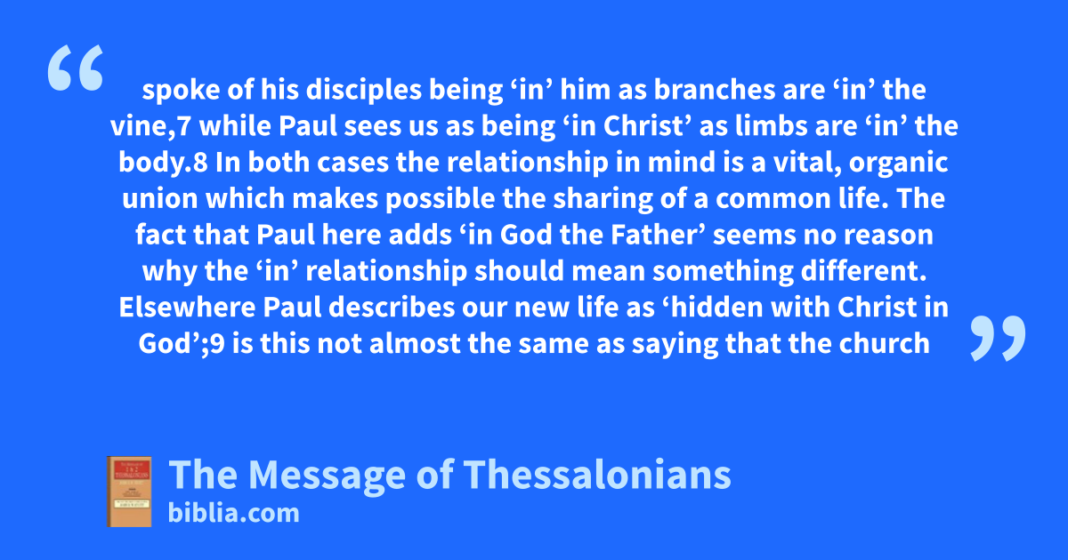 spoke of his disciples being ‘in’ him as branches are ‘in’ the vine,7 while Paul sees us as being ‘in Christ’ as limbs are ‘in’ the body.8 In both cases the relationship in mind is a vital, organic union which makes possible the sharing of a common life. The fact that Paul here adds ‘in God the Father’ seems no reason why the ‘in’ relationship should mean something different. Elsewhere Paul describes our new life as ‘hidden with Christ in God’;9 is this not almost the same as saying that the church