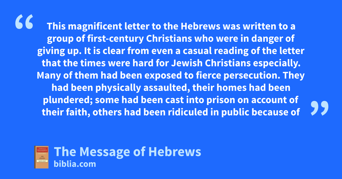 This magnificent letter to the Hebrews was written to a group of first-century Christians who were in danger of giving up. It is clear from even a casual reading of the letter that the times were hard for Jewish Christians especially. Many of them had been exposed to fierce persecution. They had been physically assaulted, their homes had been plundered; some had been cast into prison on account of their faith, others had been ridiculed in public because of