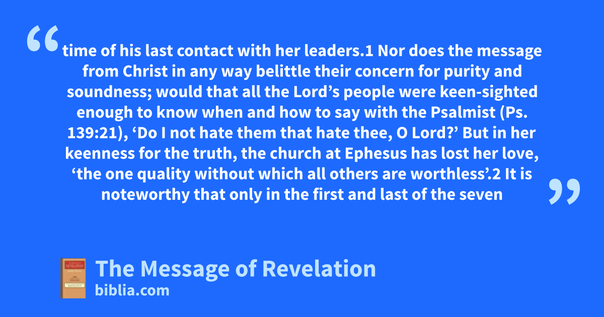time of his last contact with her leaders.1 Nor does the message from Christ in any way belittle their concern for purity and soundness; would that all the Lord’s people were keen-sighted enough to know when and how to say with the Psalmist (Ps. 139:21), ‘Do I not hate them that hate thee, O Lord?’ But in her keenness for the truth, the church at Ephesus has lost her love, ‘the one quality without which all others are worthless’.2 It is noteworthy that only in the first and last of the seven