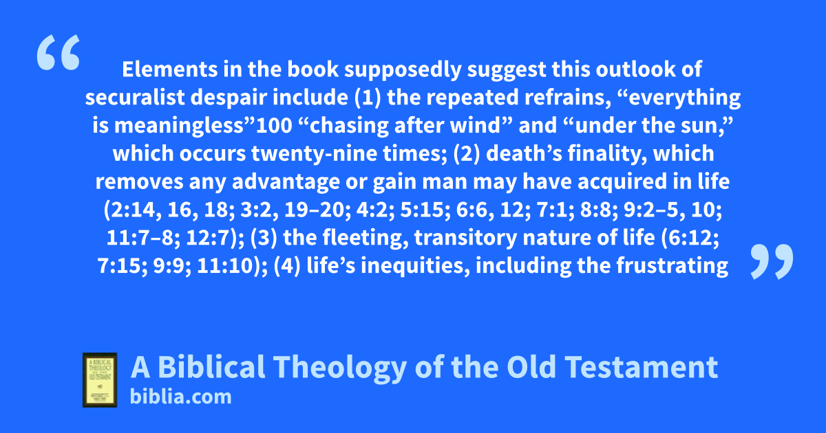 Elements in the book supposedly suggest this outlook of securalist despair include (1) the repeated refrains, “everything is meaningless”100 “chasing after wind” and “under the sun,” which occurs twenty-nine times; (2) death’s finality, which removes any advantage or gain man may have acquired in life (2:14, 16, 18; 3:2, 19–20; 4:2; 5:15; 6:6, 12; 7:1; 8:8; 9:2–5, 10; 11:7–8; 12:7); (3) the fleeting, transitory nature of life (6:12; 7:15; 9:9; 11:10); (4) life’s inequities, including the frustrating