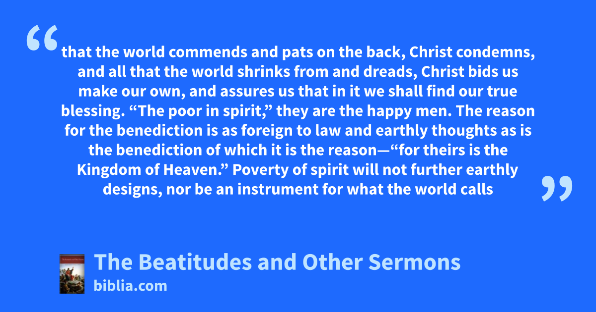 that the world commends and pats on the back, Christ condemns, and all that the world shrinks from and dreads, Christ bids us make our own, and assures us that in it we shall find our true blessing. “The poor in spirit,” they are the happy men. The reason for the benediction is as foreign to law and earthly thoughts as is the benediction of which it is the reason—“for theirs is the Kingdom of Heaven.” Poverty of spirit will not further earthly designs, nor be an instrument for what the world calls