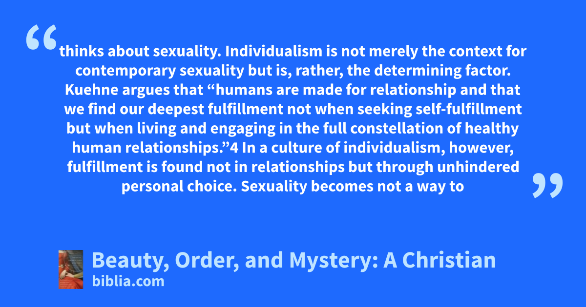 thinks about sexuality. Individualism is not merely the context for contemporary sexuality but is, rather, the determining factor. Kuehne argues that “humans are made for relationship and that we find our deepest fulfillment not when seeking self-fulfillment but when living and engaging in the full constellation of healthy human relationships.”4 In a culture of individualism, however, fulfillment is found not in relationships but through unhindered personal choice. Sexuality becomes not a way to