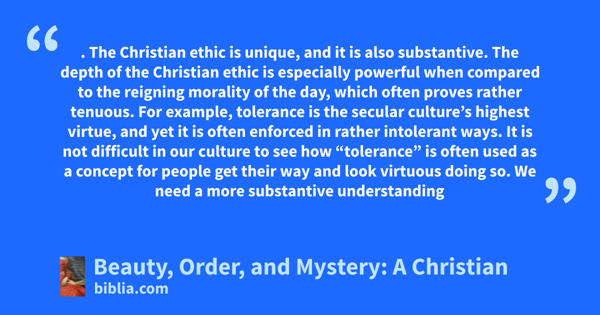 . The Christian ethic is unique, and it is also substantive. The depth of the Christian ethic is especially powerful when compared to the reigning morality of the day, which often proves rather tenuous. For example, tolerance is the secular culture’s highest virtue, and yet it is often enforced in rather intolerant ways. It is not difficult in our culture to see how “tolerance” is often used as a concept for people get their way and look virtuous doing so. We need a more substantive understanding