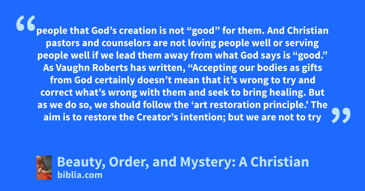people that God’s creation is not “good” for them. And Christian pastors and counselors are not loving people well or serving people well if we lead them away from what God says is “good.” As Vaughn Roberts has written, “Accepting our bodies as gifts from God certainly doesn’t mean that it’s wrong to try and correct what’s wrong with them and seek to bring healing. But as we do so, we should follow the ‘art restoration principle.’ The aim is to restore the Creator’s intention; but we are not to try