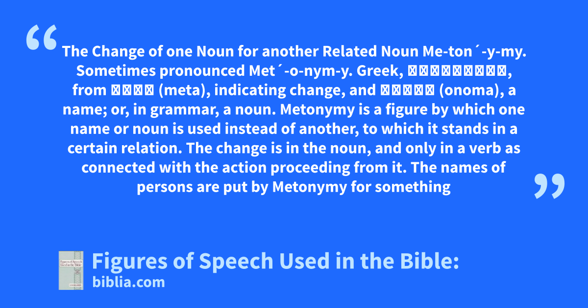 The Change of one Noun for another Related Noun Me-ton´-y-my. Sometimes pronounced Met´-o-nym-y. Greek, Μετωνυμία, from μετά (meta), indicating change, and ὄνομα (onoma), a name; or, in grammar, a noun. Metonymy is a figure by which one name or noun is used instead of another, to which it stands in a certain relation. The change is in the noun, and only in a verb as connected with the action proceeding from it. The names of persons are put by Metonymy for something
