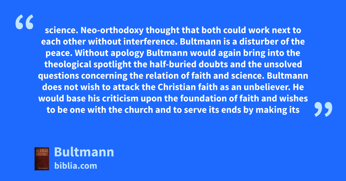 science. Neo-orthodoxy thought that both could work next to each other without interference. Bultmann is a disturber of the peace. Without apology Bultmann would again bring into the theological spotlight the half-buried doubts and the unsolved questions concerning the relation of faith and science. Bultmann does not wish to attack the Christian faith as an unbeliever. He would base his criticism upon the foundation of faith and wishes to be one with the church and to serve its ends by making its