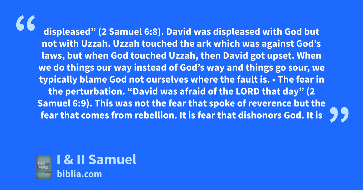 displeased” (2 Samuel 6:8). David was displeased with God but not with Uzzah. Uzzah touched the ark which was against God’s laws, but when God touched Uzzah, then David got upset. When we do things our way instead of God’s way and things go sour, we typically blame God not ourselves where the fault is. • The fear in the perturbation. “David was afraid of the LORD that day” (2 Samuel 6:9). This was not the fear that spoke of reverence but the fear that comes from rebellion. It is fear that dishonors God. It is