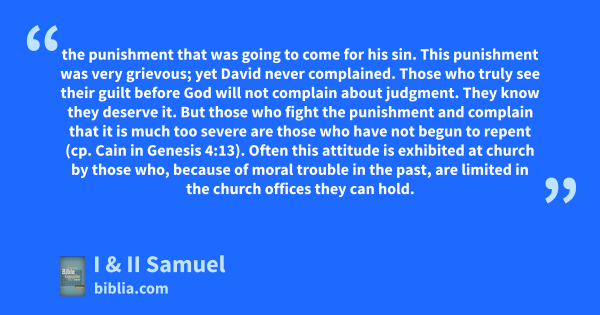 the punishment that was going to come for his sin. This punishment was very grievous; yet David never complained. Those who truly see their guilt before God will not complain about judgment. They know they deserve it. But those who fight the punishment and complain that it is much too severe are those who have not begun to repent (cp. Cain in Genesis 4:13). Often this attitude is exhibited at church by those who, because of moral trouble in the past, are limited in the church offices they can hold.