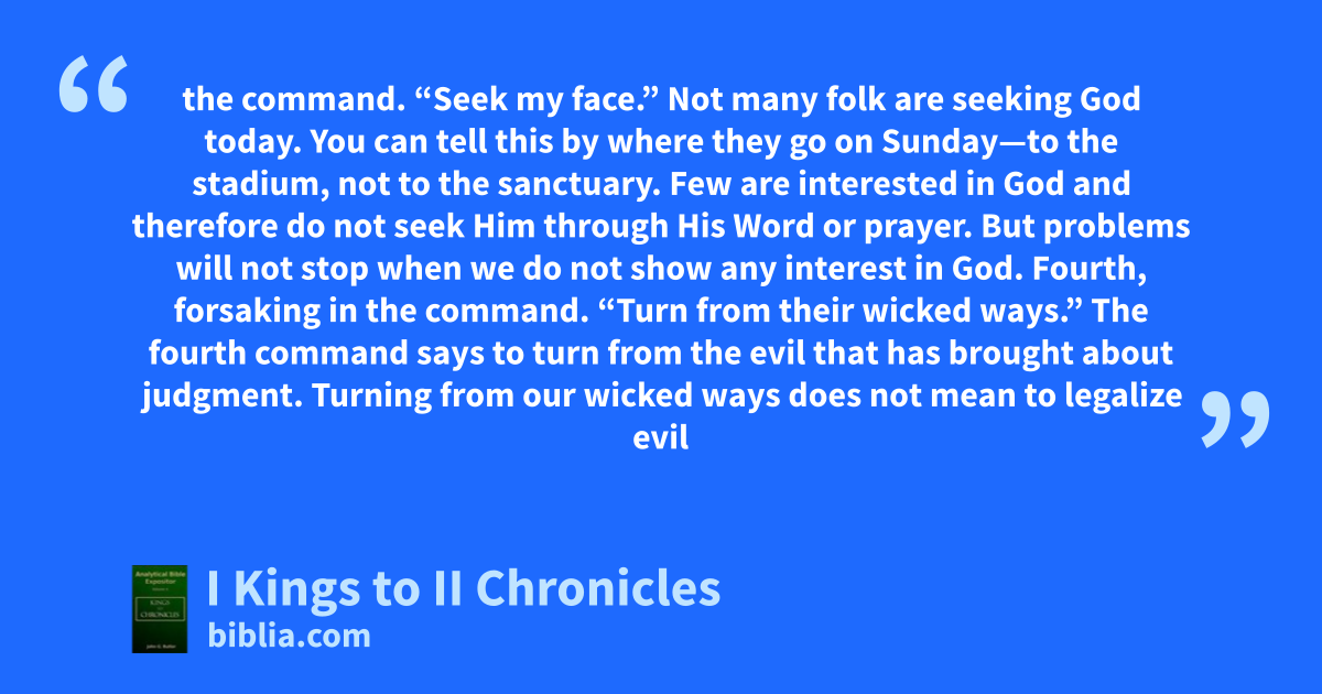 the command. “Seek my face.” Not many folk are seeking God today. You can tell this by where they go on Sunday—to the stadium, not to the sanctuary. Few are interested in God and therefore do not seek Him through His Word or prayer. But problems will not stop when we do not show any interest in God. Fourth, forsaking in the command. “Turn from their wicked ways.” The fourth command says to turn from the evil that has brought about judgment. Turning from our wicked ways does not mean to legalize evil