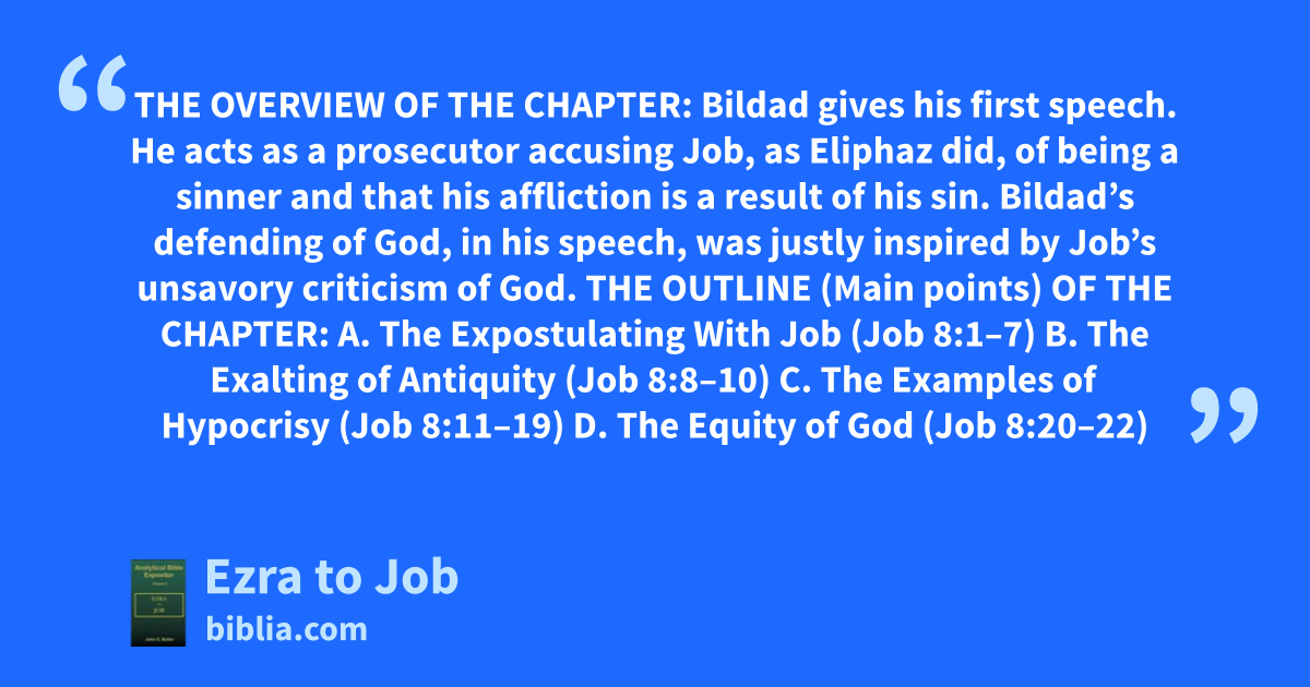 THE OVERVIEW OF THE CHAPTER: Bildad gives his first speech. He acts as a prosecutor accusing Job, as Eliphaz did, of being a sinner and that his affliction is a result of his sin. Bildad’s defending of God, in his speech, was justly inspired by Job’s unsavory criticism of God. THE OUTLINE (Main points) OF THE CHAPTER: A. The Expostulating With Job (Job 8:1–7) B. The Exalting of Antiquity (Job 8:8–10) C. The Examples of Hypocrisy (Job 8:11–19) D. The Equity of God (Job 8:20–22)