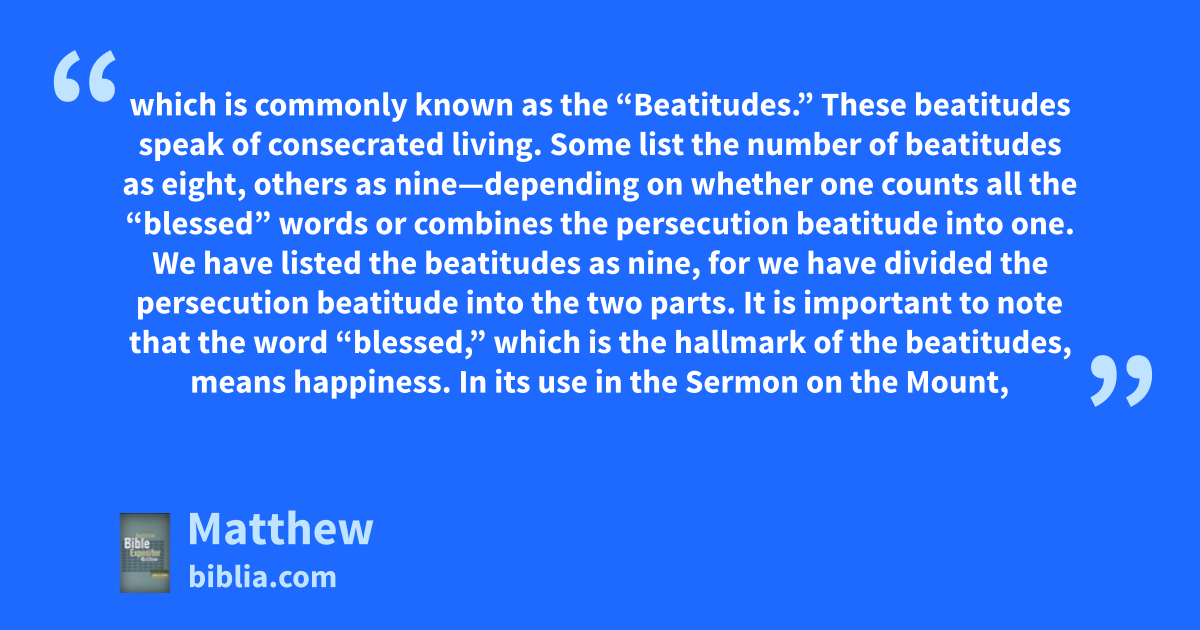 which is commonly known as the “Beatitudes.” These beatitudes speak of consecrated living. Some list the number of beatitudes as eight, others as nine—depending on whether one counts all the “blessed” words or combines the persecution beatitude into one. We have listed the beatitudes as nine, for we have divided the persecution beatitude into the two parts. It is important to note that the word “blessed,” which is the hallmark of the beatitudes, means happiness. In its use in the Sermon on the Mount,