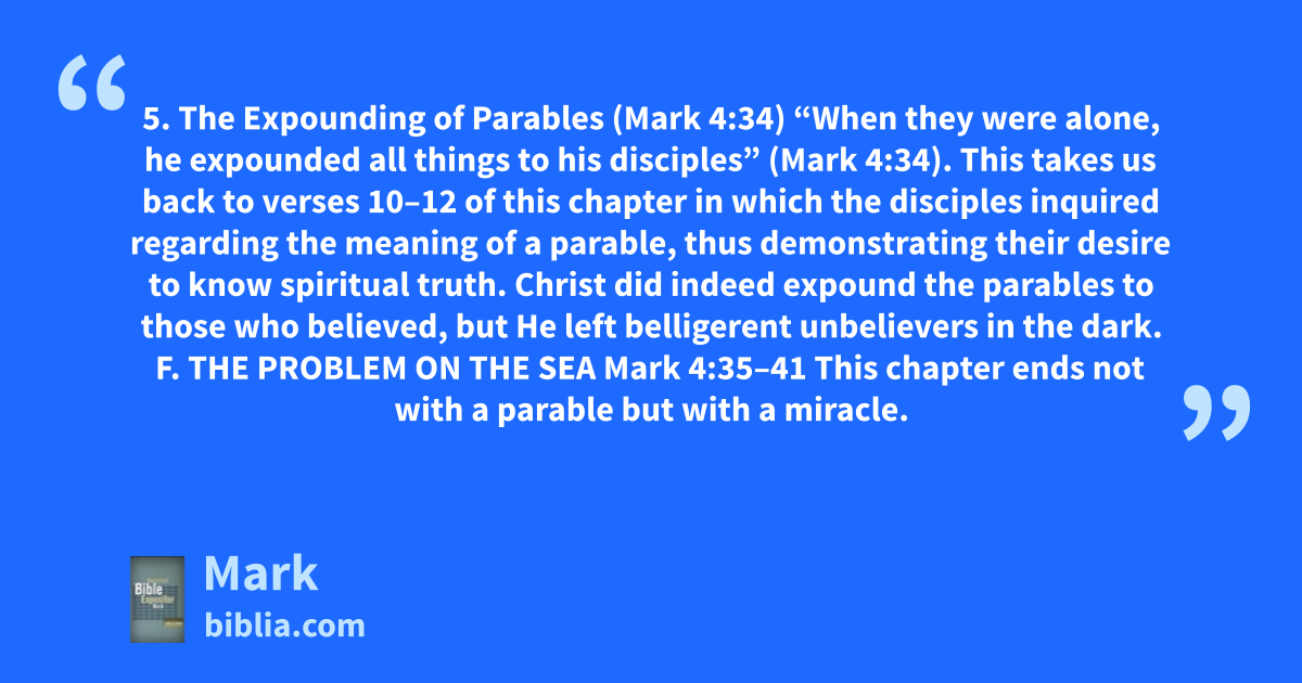 5. The Expounding of Parables (Mark 4:34) “When they were alone, he expounded all things to his disciples” (Mark 4:34). This takes us back to verses 10–12 of this chapter in which the disciples inquired regarding the meaning of a parable, thus demonstrating their desire to know spiritual truth. Christ did indeed expound the parables to those who believed, but He left belligerent unbelievers in the dark. F. THE PROBLEM ON THE SEA Mark 4:35–41 This chapter ends not with a parable but with a miracle.
