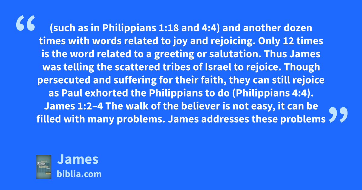 (such as in Philippians 1:18 and 4:4) and another dozen times with words related to joy and rejoicing. Only 12 times is the word related to a greeting or salutation. Thus James was telling the scattered tribes of Israel to rejoice. Though persecuted and suffering for their faith, they can still rejoice as Paul exhorted the Philippians to do (Philippians 4:4). James 1:2–4 The walk of the believer is not easy, it can be filled with many problems. James addresses these problems