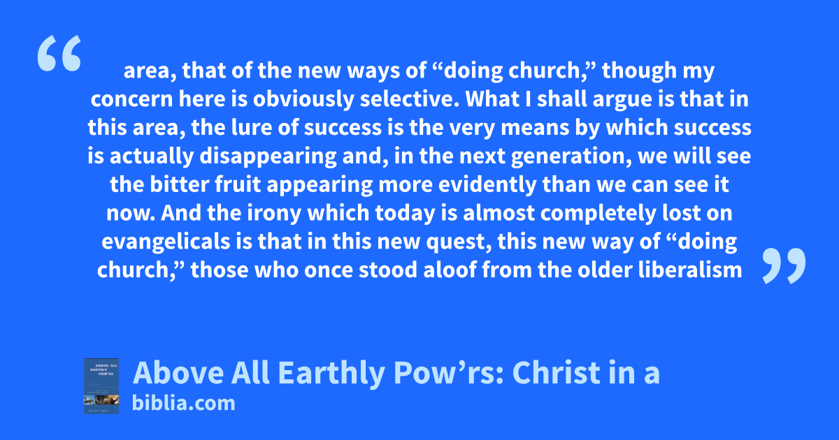 area, that of the new ways of “doing church,” though my concern here is obviously selective. What I shall argue is that in this area, the lure of success is the very means by which success is actually disappearing and, in the next generation, we will see the bitter fruit appearing more evidently than we can see it now. And the irony which today is almost completely lost on evangelicals is that in this new quest, this new way of “doing church,” those who once stood aloof from the older liberalism