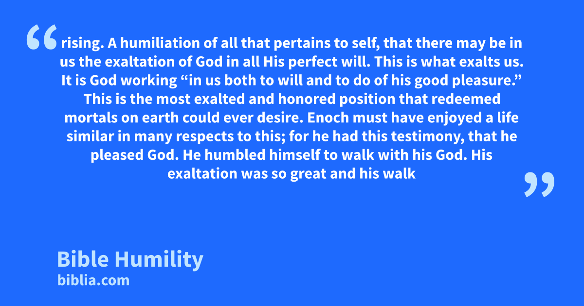 rising. A humiliation of all that pertains to self, that there may be in us the exaltation of God in all His perfect will. This is what exalts us. It is God working “in us both to will and to do of his good pleasure.” This is the most exalted and honored position that redeemed mortals on earth could ever desire. Enoch must have enjoyed a life similar in many respects to this; for he had this testimony, that he pleased God. He humbled himself to walk with his God. His exaltation was so great and his walk