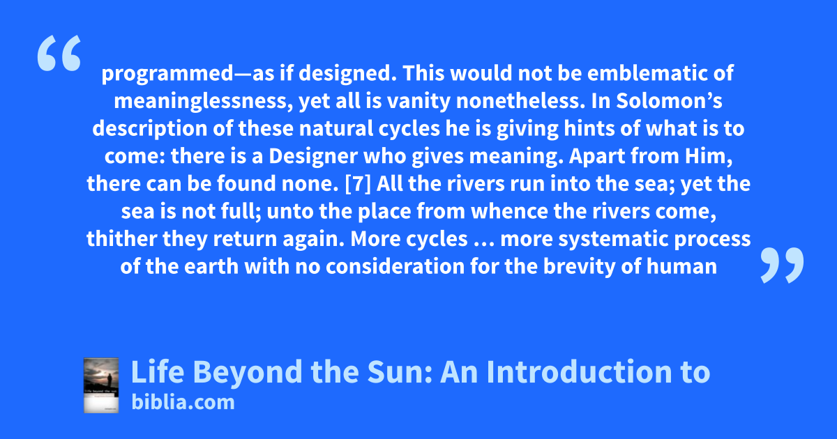 programmed—as if designed. This would not be emblematic of meaninglessness, yet all is vanity nonetheless. In Solomon’s description of these natural cycles he is giving hints of what is to come: there is a Designer who gives meaning. Apart from Him, there can be found none. [7] All the rivers run into the sea; yet the sea is not full; unto the place from whence the rivers come, thither they return again. More cycles … more systematic process of the earth with no consideration for the brevity of human