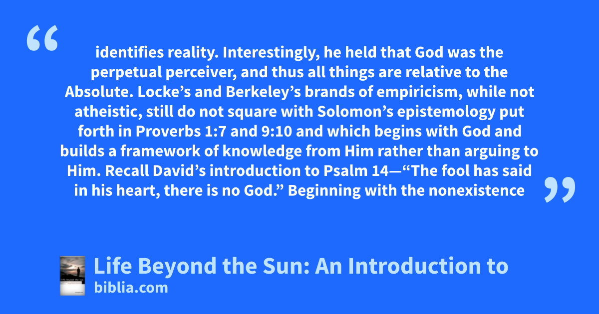identifies reality. Interestingly, he held that God was the perpetual perceiver, and thus all things are relative to the Absolute. Locke’s and Berkeley’s brands of empiricism, while not atheistic, still do not square with Solomon’s epistemology put forth in Proverbs 1:7 and 9:10 and which begins with God and builds a framework of knowledge from Him rather than arguing to Him. Recall David’s introduction to Psalm 14—“The fool has said in his heart, there is no God.” Beginning with the nonexistence
