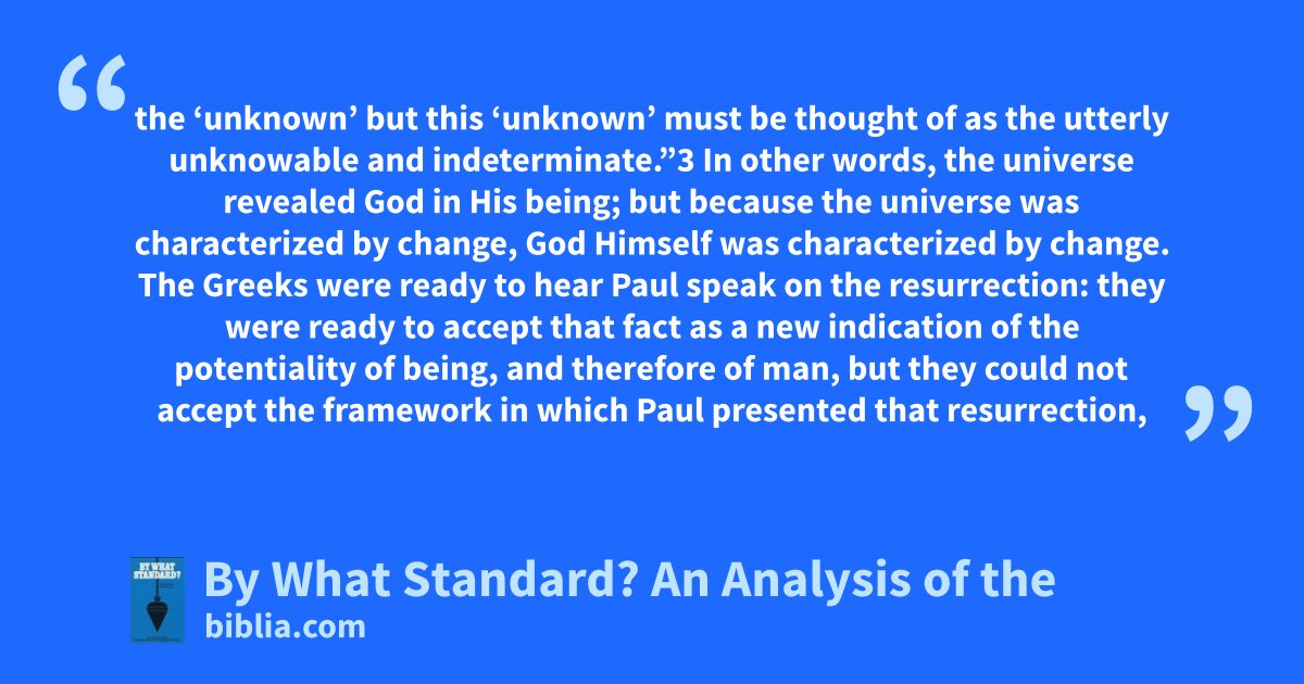 the ‘unknown’ but this ‘unknown’ must be thought of as the utterly unknowable and indeterminate.”3 In other words, the universe revealed God in His being; but because the universe was characterized by change, God Himself was characterized by change. The Greeks were ready to hear Paul speak on the resurrection: they were ready to accept that fact as a new indication of the potentiality of being, and therefore of man, but they could not accept the framework in which Paul presented that resurrection,