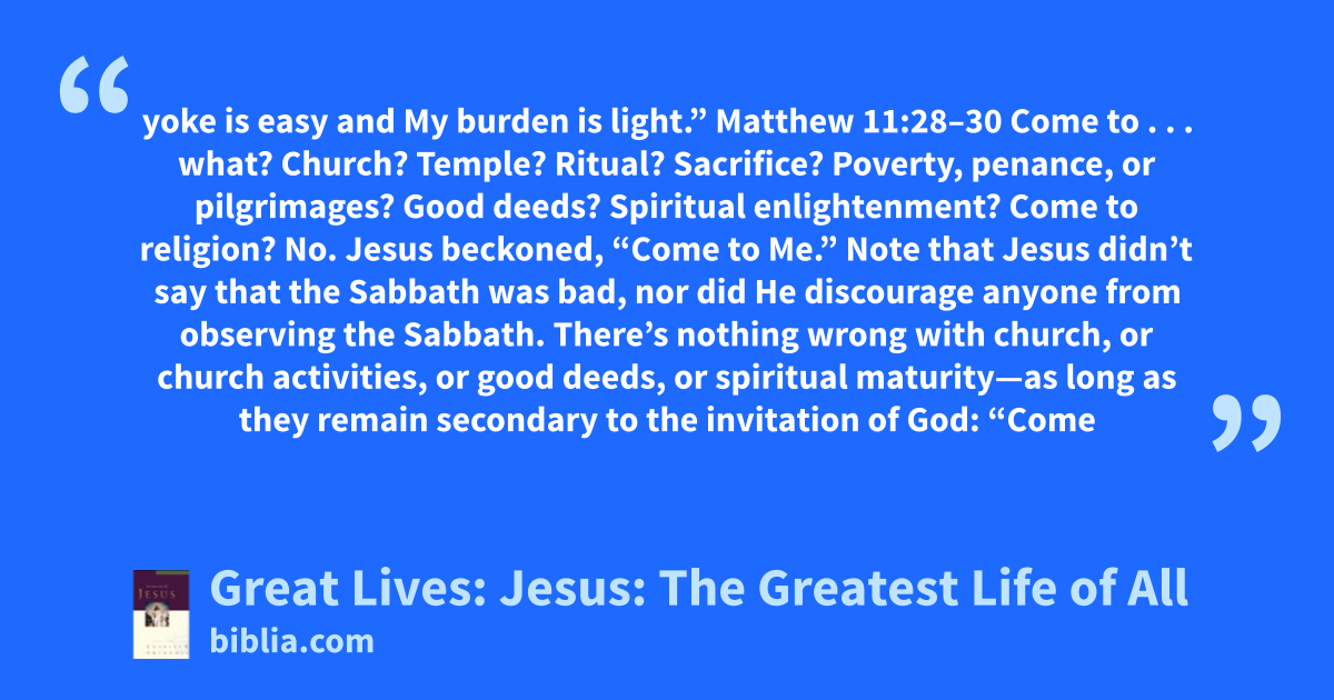 yoke is easy and My burden is light.” Matthew 11:28–30 Come to . . . what? Church? Temple? Ritual? Sacrifice? Poverty, penance, or pilgrimages? Good deeds? Spiritual enlightenment? Come to religion? No. Jesus beckoned, “Come to Me.” Note that Jesus didn’t say that the Sabbath was bad, nor did He discourage anyone from observing the Sabbath. There’s nothing wrong with church, or church activities, or good deeds, or spiritual maturity—as long as they remain secondary to the invitation of God: “Come