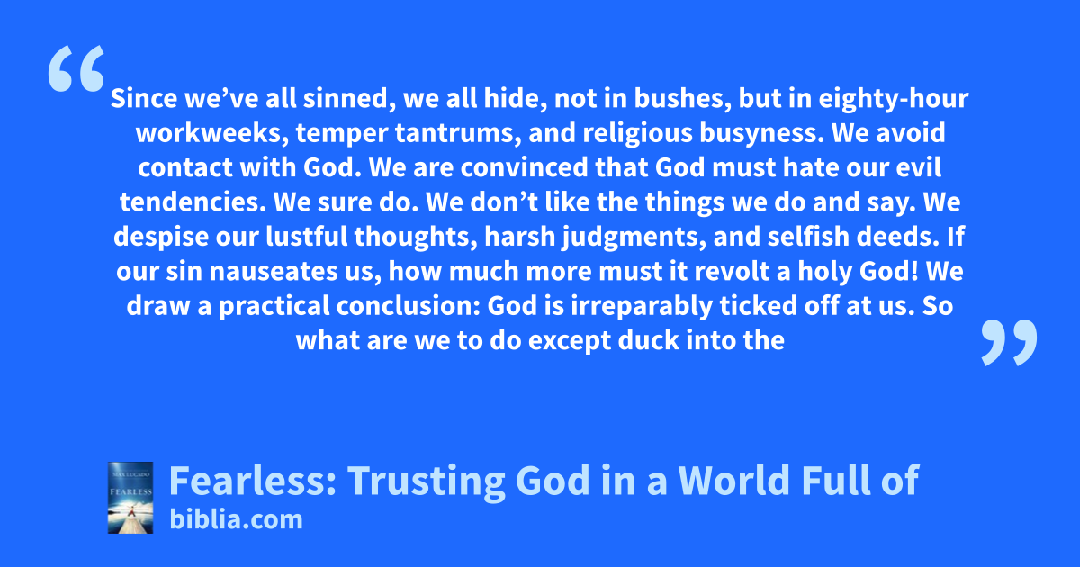 Since we’ve all sinned, we all hide, not in bushes, but in eighty-hour workweeks, temper tantrums, and religious busyness. We avoid contact with God. We are convinced that God must hate our evil tendencies. We sure do. We don’t like the things we do and say. We despise our lustful thoughts, harsh judgments, and selfish deeds. If our sin nauseates us, how much more must it revolt a holy God! We draw a practical conclusion: God is irreparably ticked off at us. So what are we to do except duck into the