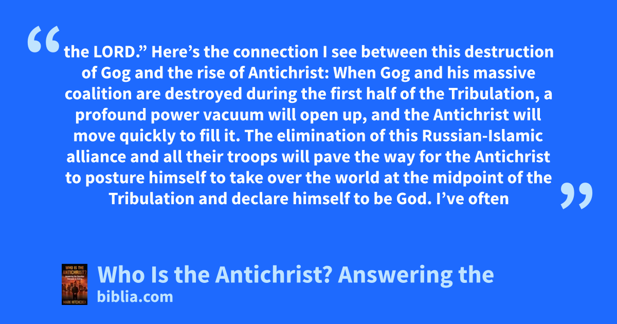 the LORD.” Here’s the connection I see between this destruction of Gog and the rise of Antichrist: When Gog and his massive coalition are destroyed during the first half of the Tribulation, a profound power vacuum will open up, and the Antichrist will move quickly to fill it. The elimination of this Russian-Islamic alliance and all their troops will pave the way for the Antichrist to posture himself to take over the world at the midpoint of the Tribulation and declare himself to be God. I’ve often