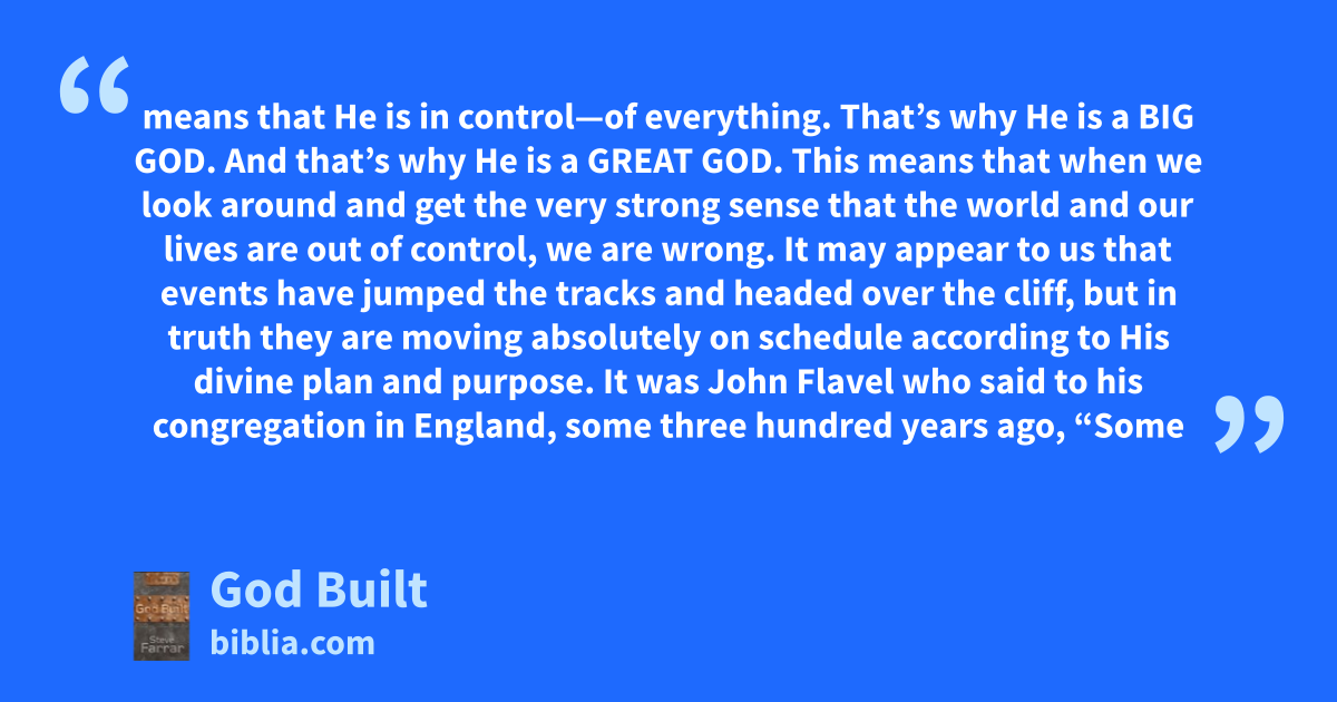 means that He is in control—of everything. That’s why He is a BIG GOD. And that’s why He is a GREAT GOD. This means that when we look around and get the very strong sense that the world and our lives are out of control, we are wrong. It may appear to us that events have jumped the tracks and headed over the cliff, but in truth they are moving absolutely on schedule according to His divine plan and purpose. It was John Flavel who said to his congregation in England, some three hundred years ago, “Some