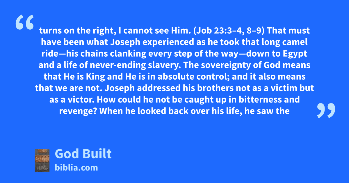 turns on the right, I cannot see Him. (Job 23:3–4, 8–9) That must have been what Joseph experienced as he took that long camel ride—his chains clanking every step of the way—down to Egypt and a life of never-ending slavery. The sovereignty of God means that He is King and He is in absolute control; and it also means that we are not. Joseph addressed his brothers not as a victim but as a victor. How could he not be caught up in bitterness and revenge? When he looked back over his life, he saw the
