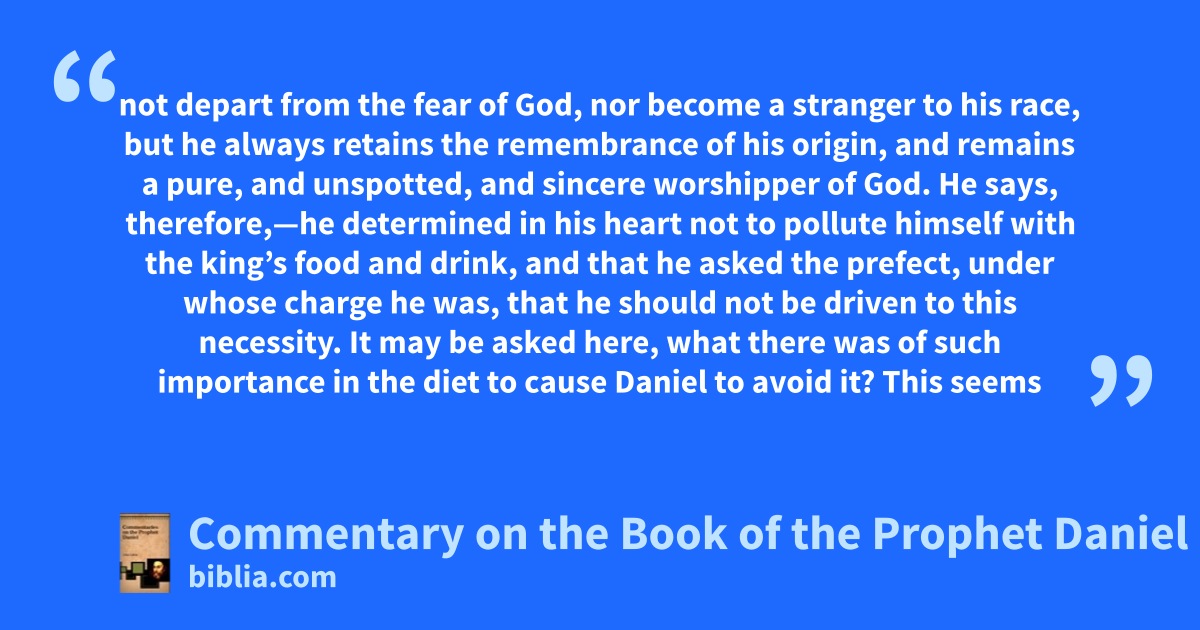 not depart from the fear of God, nor become a stranger to his race, but he always retains the remembrance of his origin, and remains a pure, and unspotted, and sincere worshipper of God. He says, therefore,—he determined in his heart not to pollute himself with the king’s food and drink, and that he asked the prefect, under whose charge he was, that he should not be driven to this necessity. It may be asked here, what there was of such importance in the diet to cause Daniel to avoid it? This seems