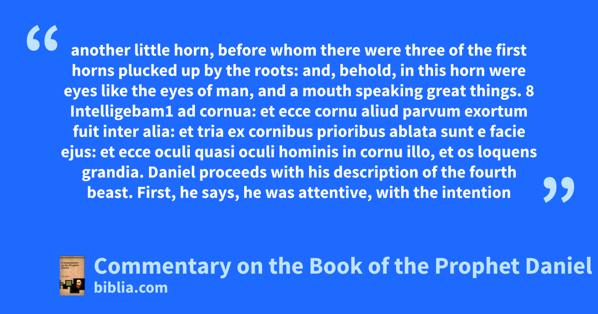 another little horn, before whom there were three of the first horns plucked up by the roots: and, behold, in this horn were eyes like the eyes of man, and a mouth speaking great things. 8 Intelligebam1 ad cornua: et ecce cornu aliud parvum exortum fuit inter alia: et tria ex cornibus prioribus ablata sunt e facie ejus: et ecce oculi quasi oculi hominis in cornu illo, et os loquens grandia. Daniel proceeds with his description of the fourth beast. First, he says, he was attentive, with the intention