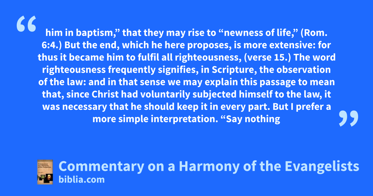 him in baptism,” that they may rise to “newness of life,” (Rom. 6:4.) But the end, which he here proposes, is more extensive: for thus it became him to fulfil all righteousness, (verse 15.) The word righteousness frequently signifies, in Scripture, the observation of the law: and in that sense we may explain this passage to mean that, since Christ had voluntarily subjected himself to the law, it was necessary that he should keep it in every part. But I prefer a more simple interpretation. “Say nothing