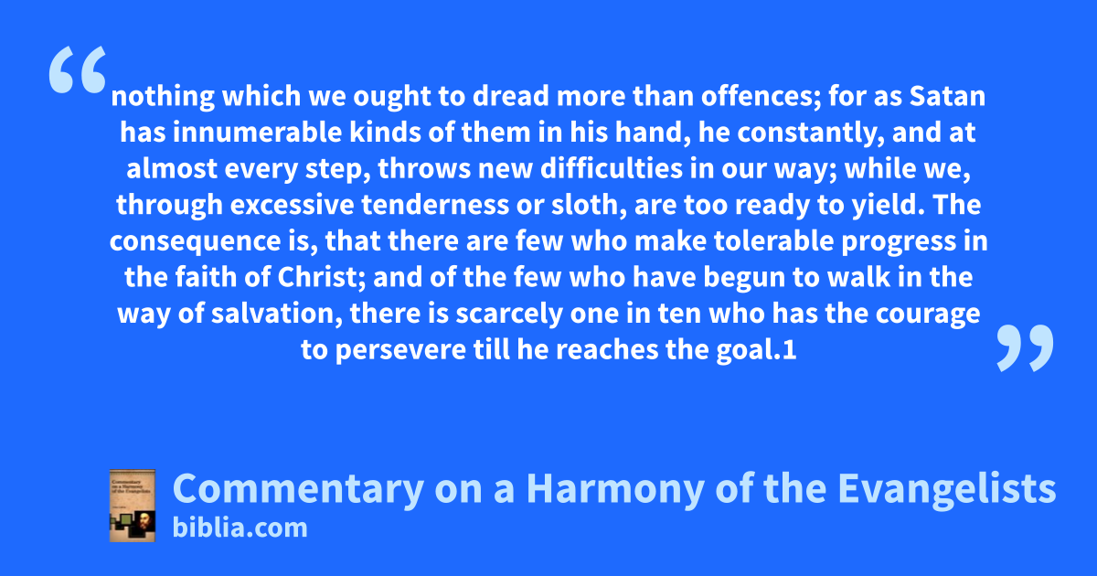 nothing which we ought to dread more than offences; for as Satan has innumerable kinds of them in his hand, he constantly, and at almost every step, throws new difficulties in our way; while we, through excessive tenderness or sloth, are too ready to yield. The consequence is, that there are few who make tolerable progress in the faith of Christ; and of the few who have begun to walk in the way of salvation, there is scarcely one in ten who has the courage to persevere till he reaches the goal.1