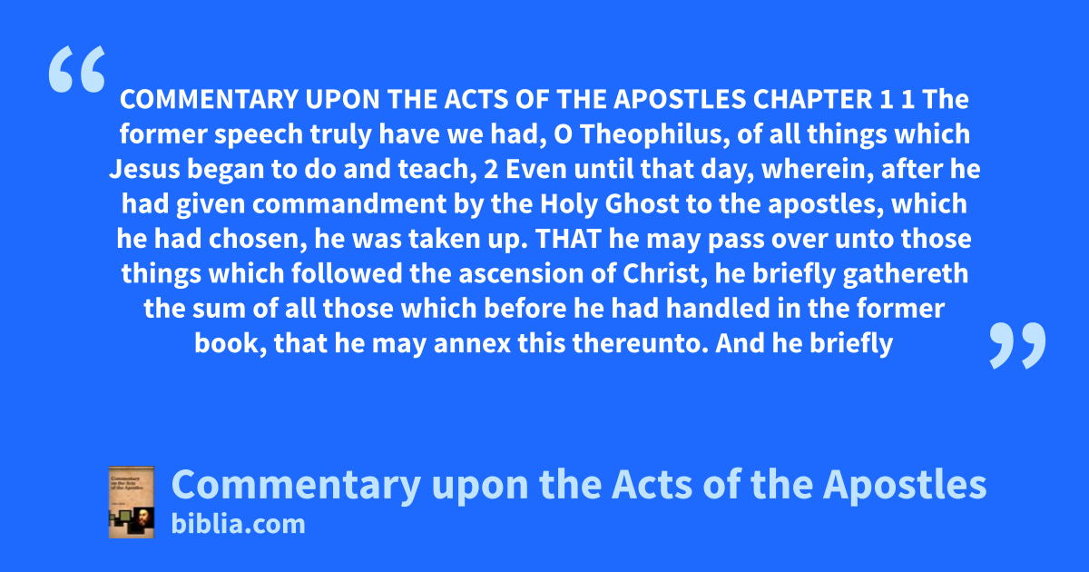 COMMENTARY UPON THE ACTS OF THE APOSTLES CHAPTER 1 1 The former speech truly have we had, O Theophilus, of all things which Jesus began to do and teach, 2 Even until that day, wherein, after he had given commandment by the Holy Ghost to the apostles, which he had chosen, he was taken up. THAT he may pass over unto those things which followed the ascension of Christ, he briefly gathereth the sum of all those which before he had handled in the former book, that he may annex this thereunto. And he briefly