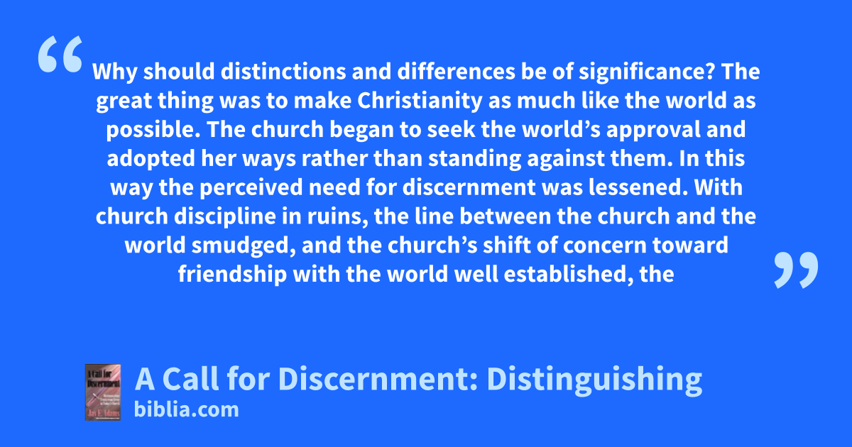 Why should distinctions and differences be of significance? The great thing was to make Christianity as much like the world as possible. The church began to seek the world’s approval and adopted her ways rather than standing against them. In this way the perceived need for discernment was lessened. With church discipline in ruins, the line between the church and the world smudged, and the church’s shift of concern toward friendship with the world well established, the
