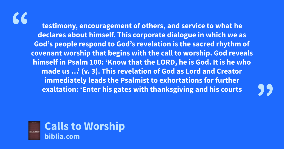 In the common practice of Christian churches, across many traditions, a call to worship is typically a few lines of Scripture (or a combination of Scripture texts) expressed at the beginning of a church service. The call to worship exhorts God's people to turn from worldly distractions and to focus hearts, minds and actions on revering him. If you are involved with leading worship in the church...