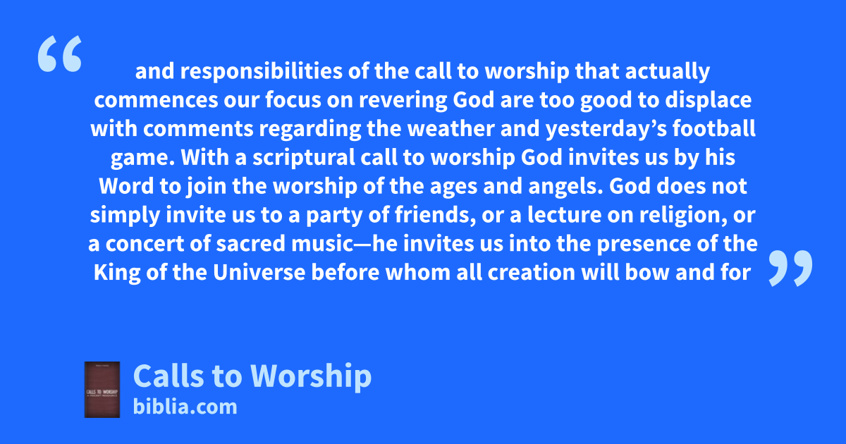 In the common practice of Christian churches, across many traditions, a call to worship is typically a few lines of Scripture (or a combination of Scripture texts) expressed at the beginning of a church service. The call to worship exhorts God's people to turn from worldly distractions and to focus hearts, minds and actions on revering him. If you are involved with leading worship in the church...
