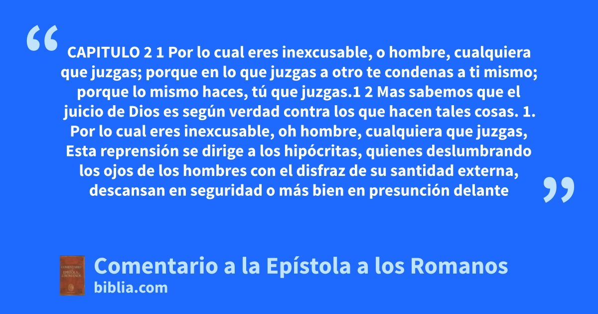CAPITULO 2 1 Por lo cual eres inexcusable, o hombre, cualquiera que juzgas; porque en lo que juzgas a otro te condenas a ti mismo; porque lo mismo haces, tú que juzgas.1 2 Mas sabemos que el juicio de Dios es según verdad contra los que hacen tales cosas. 1. Por lo cual eres inexcusable, oh hombre, cualquiera que juzgas, Esta reprensión se dirige a los hipócritas, quienes deslumbrando los ojos de los hombres con el disfraz de su santidad externa, descansan en seguridad o más bien en presunción delante