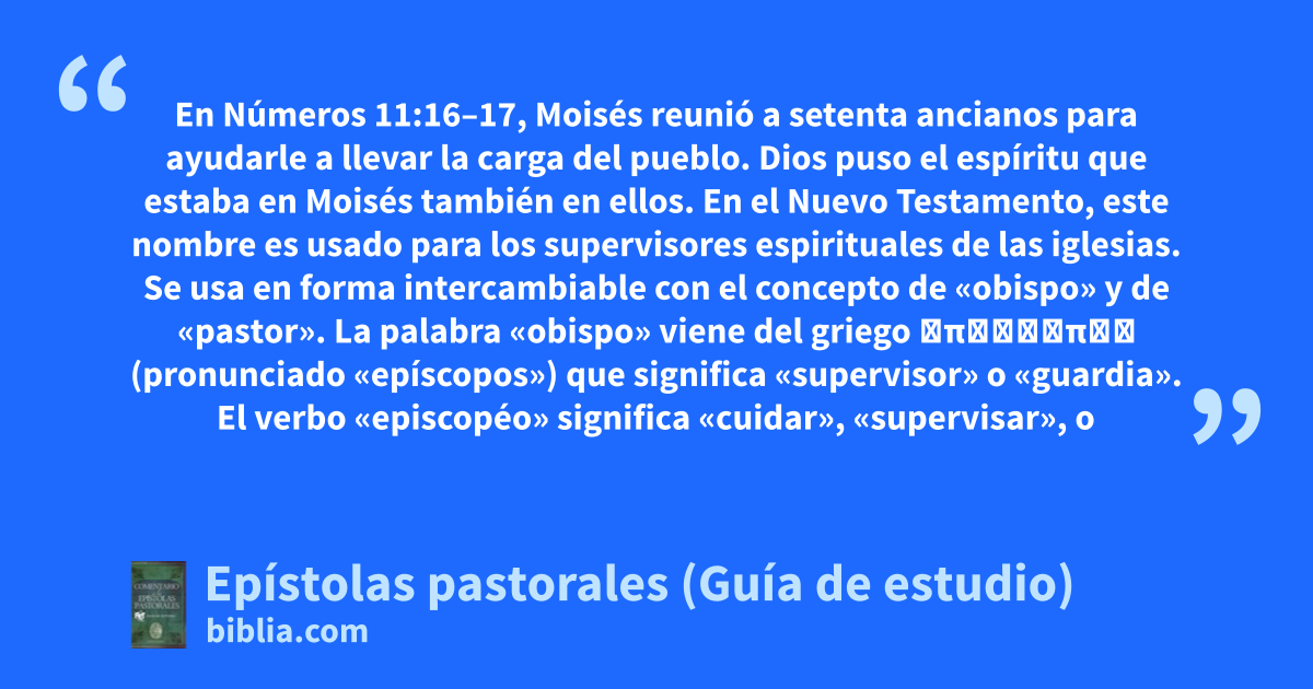 En Números 11:16–17, Moisés reunió a setenta ancianos para ayudarle a llevar la carga del pueblo. Dios puso el espíritu que estaba en Moisés también en ellos. En el Nuevo Testamento, este nombre es usado para los supervisores espirituales de las iglesias. Se usa en forma intercambiable con el concepto de «obispo» y de «pastor». La palabra «obispo» viene del griego ἐπίσκοπος (pronunciado «epíscopos») que significa «supervisor» o «guardia». El verbo «episcopéo» significa «cuidar», «supervisar», o