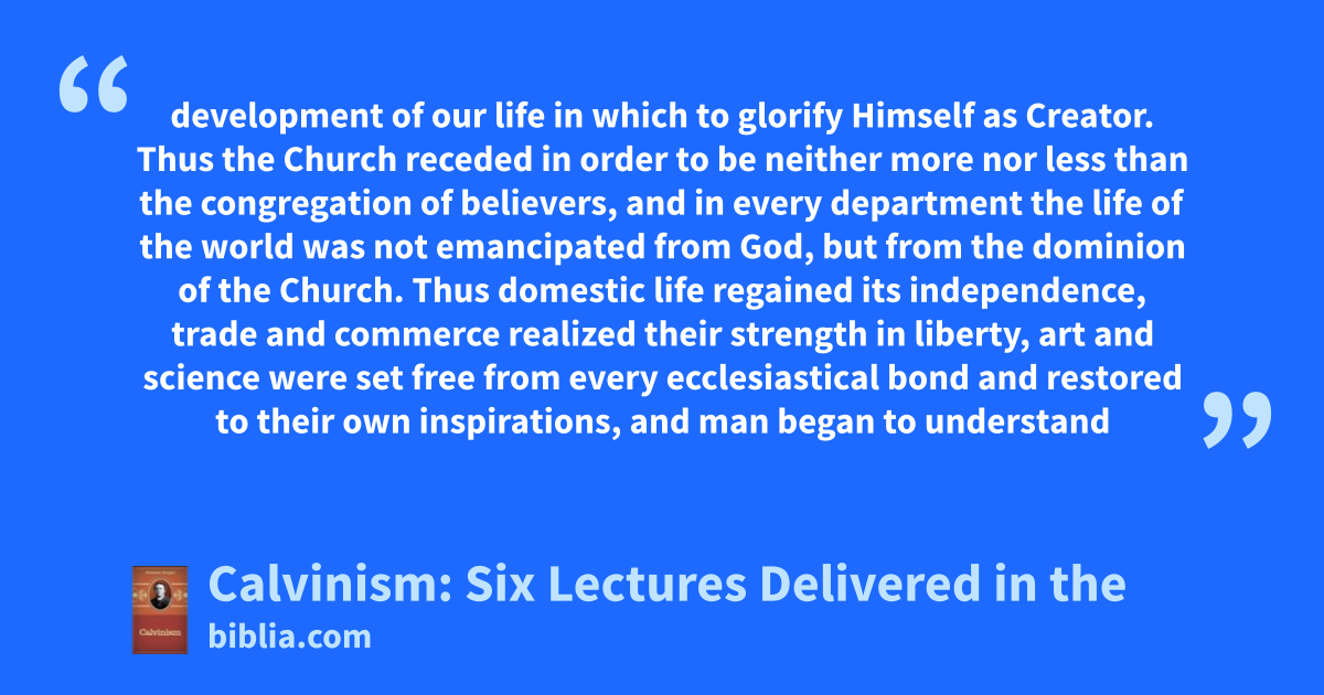 development of our life in which to glorify Himself as Creator. Thus the Church receded in order to be neither more nor less than the congregation of believers, and in every department the life of the world was not emancipated from God, but from the dominion of the Church. Thus domestic life regained its independence, trade and commerce realized their strength in liberty, art and science were set free from every ecclesiastical bond and restored to their own inspirations, and man began to understand