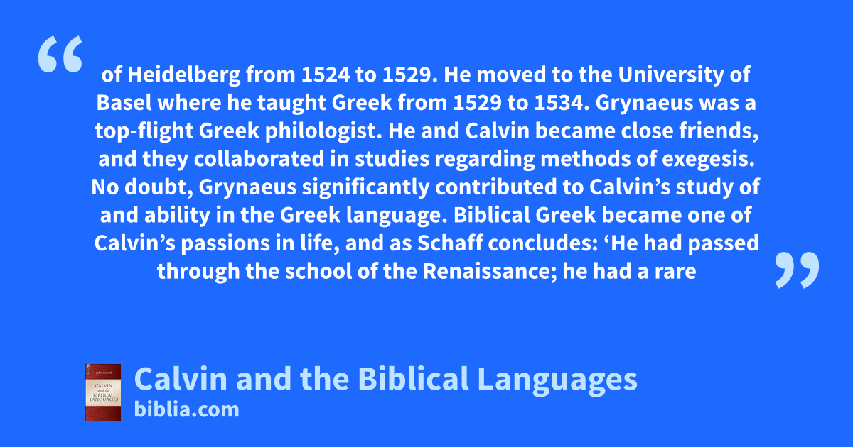 of Heidelberg from 1524 to 1529. He moved to the University of Basel where he taught Greek from 1529 to 1534. Grynaeus was a top-flight Greek philologist. He and Calvin became close friends, and they collaborated in studies regarding methods of exegesis. No doubt, Grynaeus significantly contributed to Calvin’s study of and ability in the Greek language. Biblical Greek became one of Calvin’s passions in life, and as Schaff concludes: ‘He had passed through the school of the Renaissance; he had a rare