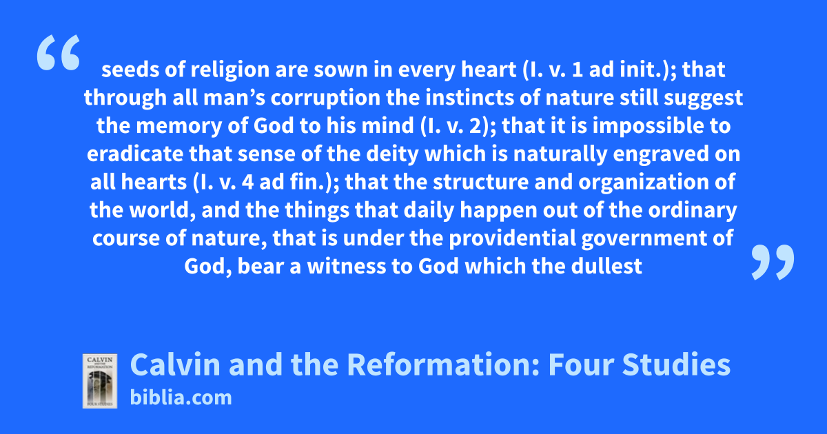 seeds of religion are sown in every heart (I. v. 1 ad init.); that through all man’s corruption the instincts of nature still suggest the memory of God to his mind (I. v. 2); that it is impossible to eradicate that sense of the deity which is naturally engraved on all hearts (I. v. 4 ad fin.); that the structure and organization of the world, and the things that daily happen out of the ordinary course of nature, that is under the providential government of God, bear a witness to God which the dullest
