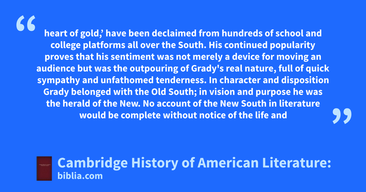 heart of gold,’ have been declaimed from hundreds of school and college platforms all over the South. His continued popularity proves that his sentiment was not merely a device for moving an audience but was the outpouring of Grady's real nature, full of quick sympathy and unfathomed tenderness. In character and disposition Grady belonged with the Old South; in vision and purpose he was the herald of the New. No account of the New South in literature would be complete without notice of the life and