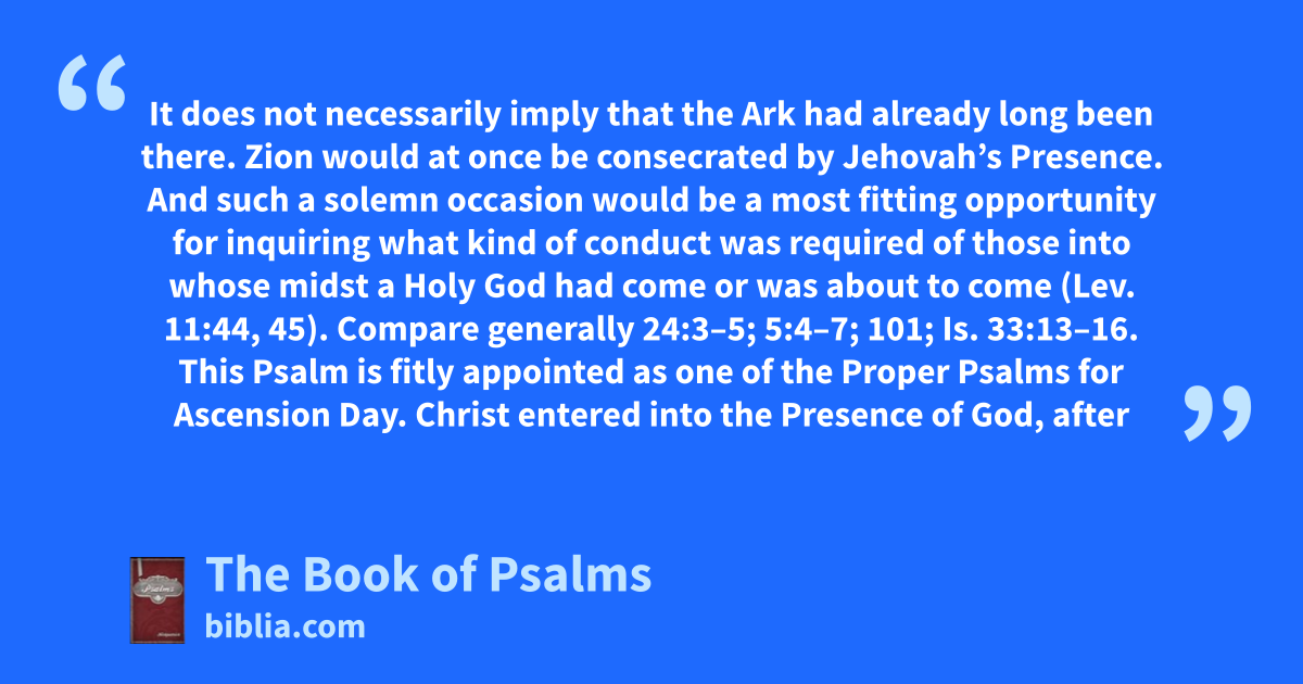 It does not necessarily imply that the Ark had already long been there. Zion would at once be consecrated by Jehovah’s Presence. And such a solemn occasion would be a most fitting opportunity for inquiring what kind of conduct was required of those into whose midst a Holy God had come or was about to come (Lev. 11:44, 45). Compare generally 24:3–5; 5:4–7; 101; Is. 33:13–16. This Psalm is fitly appointed as one of the Proper Psalms for Ascension Day. Christ entered into the Presence of God, after