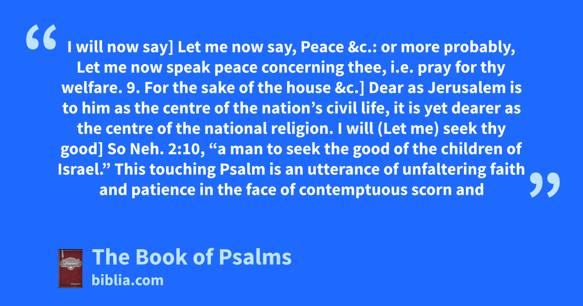 I will now say] Let me now say, Peace &c.: or more probably, Let me now speak peace concerning thee, i.e. pray for thy welfare. 9. For the sake of the house &c.] Dear as Jerusalem is to him as the centre of the nation’s civil life, it is yet dearer as the centre of the national religion. I will (Let me) seek thy good] So Neh. 2:10, “a man to seek the good of the children of Israel.” This touching Psalm is an utterance of unfaltering faith and patience in the face of contemptuous scorn and