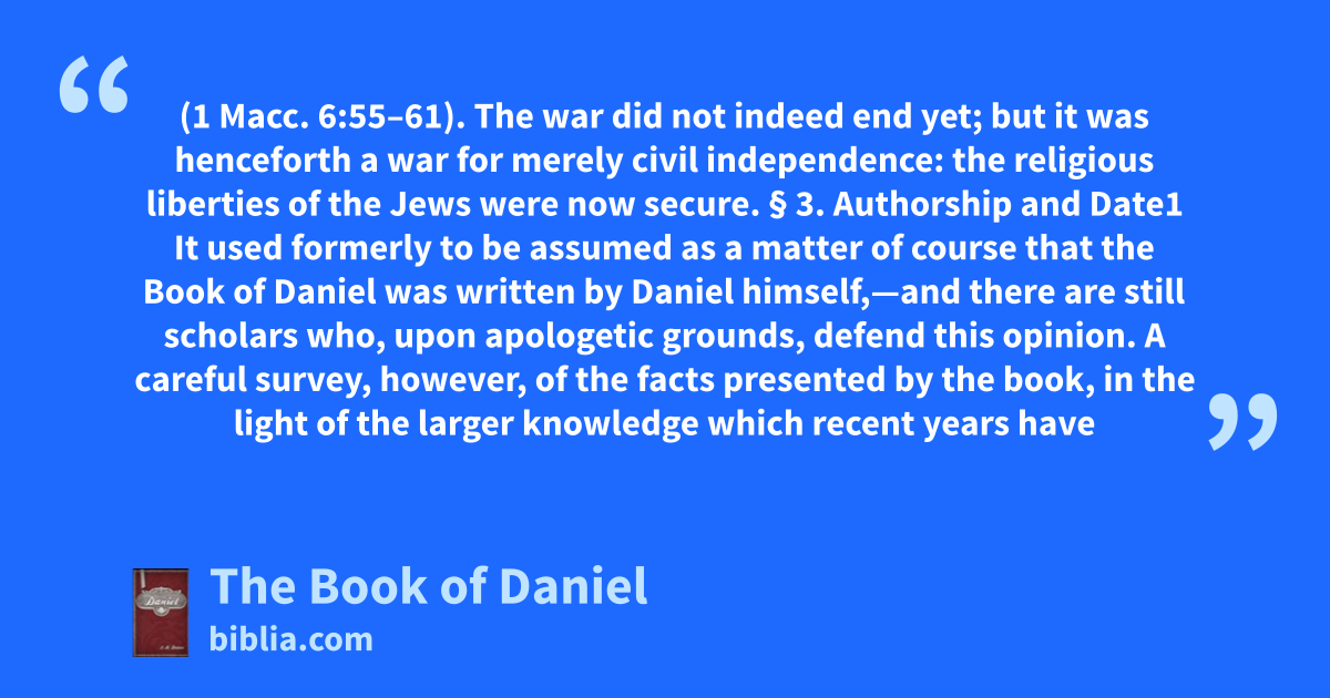 (1 Macc. 6:55–61). The war did not indeed end yet; but it was henceforth a war for merely civil independence: the religious liberties of the Jews were now secure. § 3. Authorship and Date1 It used formerly to be assumed as a matter of course that the Book of Daniel was written by Daniel himself,—and there are still scholars who, upon apologetic grounds, defend this opinion. A careful survey, however, of the facts presented by the book, in the light of the larger knowledge which recent years have