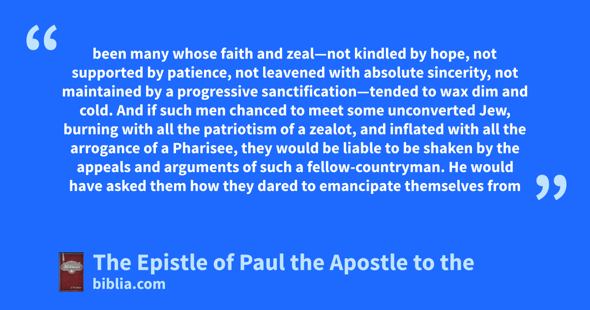 been many whose faith and zeal—not kindled by hope, not supported by patience, not leavened with absolute sincerity, not maintained by a progressive sanctification—tended to wax dim and cold. And if such men chanced to meet some unconverted Jew, burning with all the patriotism of a zealot, and inflated with all the arrogance of a Pharisee, they would be liable to be shaken by the appeals and arguments of such a fellow-countryman. He would have asked them how they dared to emancipate themselves from