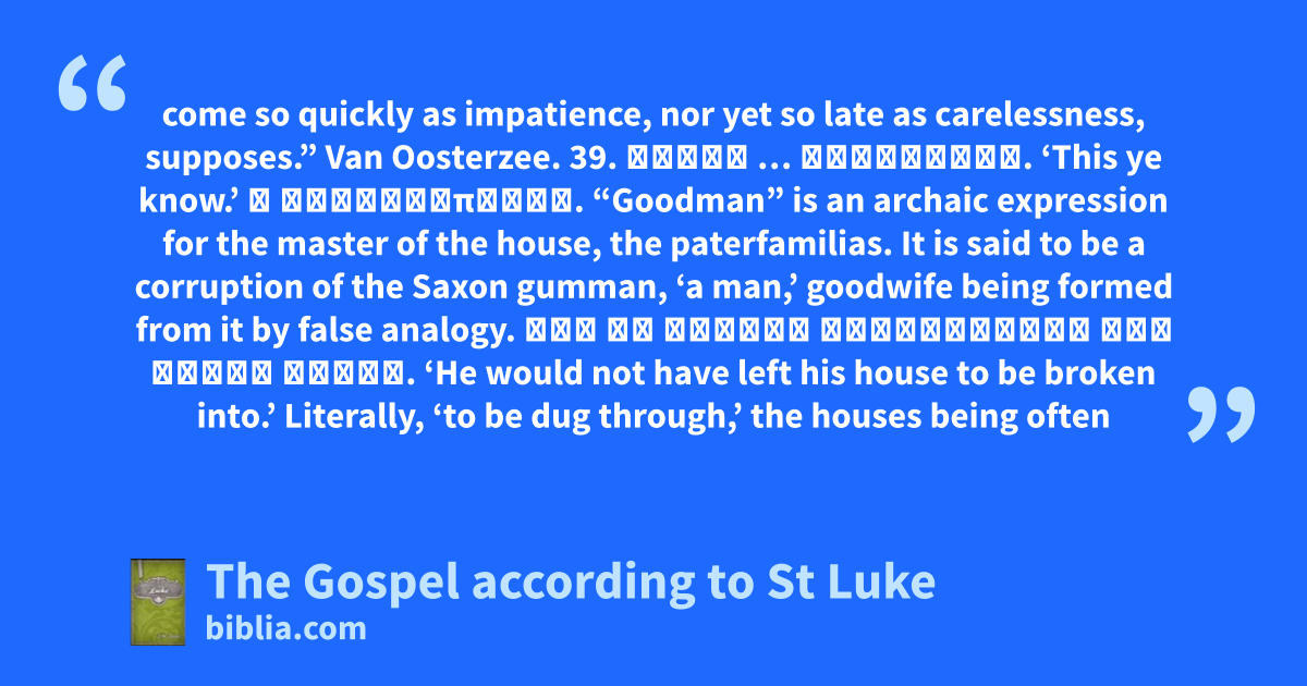 come so quickly as impatience, nor yet so late as carelessness, supposes.” Van Oosterzee. 39. τοῦτο … γινώσκετε. ‘This ye know.’ ὁ οἰκοδεσπότης. “Goodman” is an archaic expression for the master of the house, the paterfamilias. It is said to be a corruption of the Saxon gumman, ‘a man,’ goodwife being formed from it by false analogy. οὐκ ἂν ἀφῆκεν διορυχθῆναι τὸν οἶκον αὐτοῦ. ‘He would not have left his house to be broken into.’ Literally, ‘to be dug through,’ the houses being often