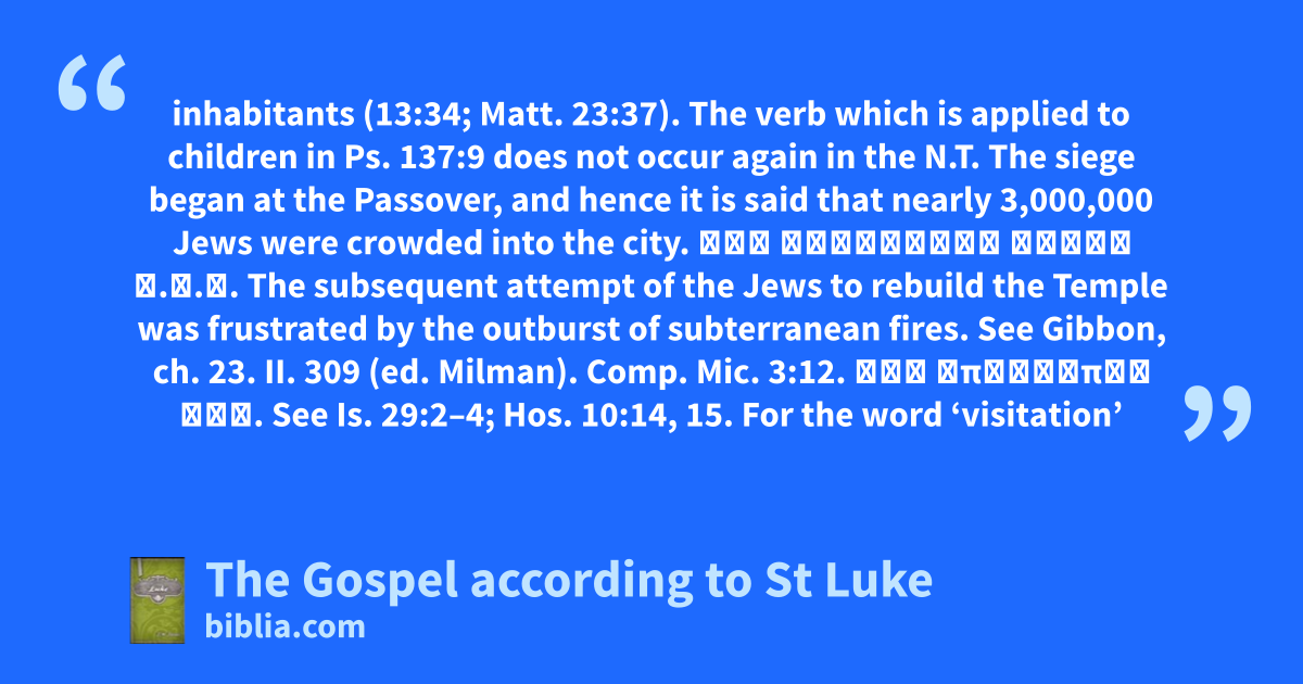 inhabitants (13:34; Matt. 23:37). The verb which is applied to children in Ps. 137:9 does not occur again in the N.T. The siege began at the Passover, and hence it is said that nearly 3,000,000 Jews were crowded into the city. οὐκ ἀφήσουσιν λίθον κ.τ.λ. The subsequent attempt of the Jews to rebuild the Temple was frustrated by the outburst of subterranean fires. See Gibbon, ch. 23. II. 309 (ed. Milman). Comp. Mic. 3:12. τῆς ἐπισκοπῆς σου. See Is. 29:2–4; Hos. 10:14, 15. For the word ‘visitation’