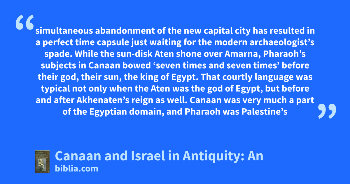 simultaneous abandonment of the new capital city has resulted in a perfect time capsule just waiting for the modern archaeologist’s spade. While the sun-disk Aten shone over Amarna, Pharaoh’s subjects in Canaan bowed ‘seven times and seven times’ before their god, their sun, the king of Egypt. That courtly language was typical not only when the Aten was the god of Egypt, but before and after Akhenaten’s reign as well. Canaan was very much a part of the Egyptian domain, and Pharaoh was Palestine’s