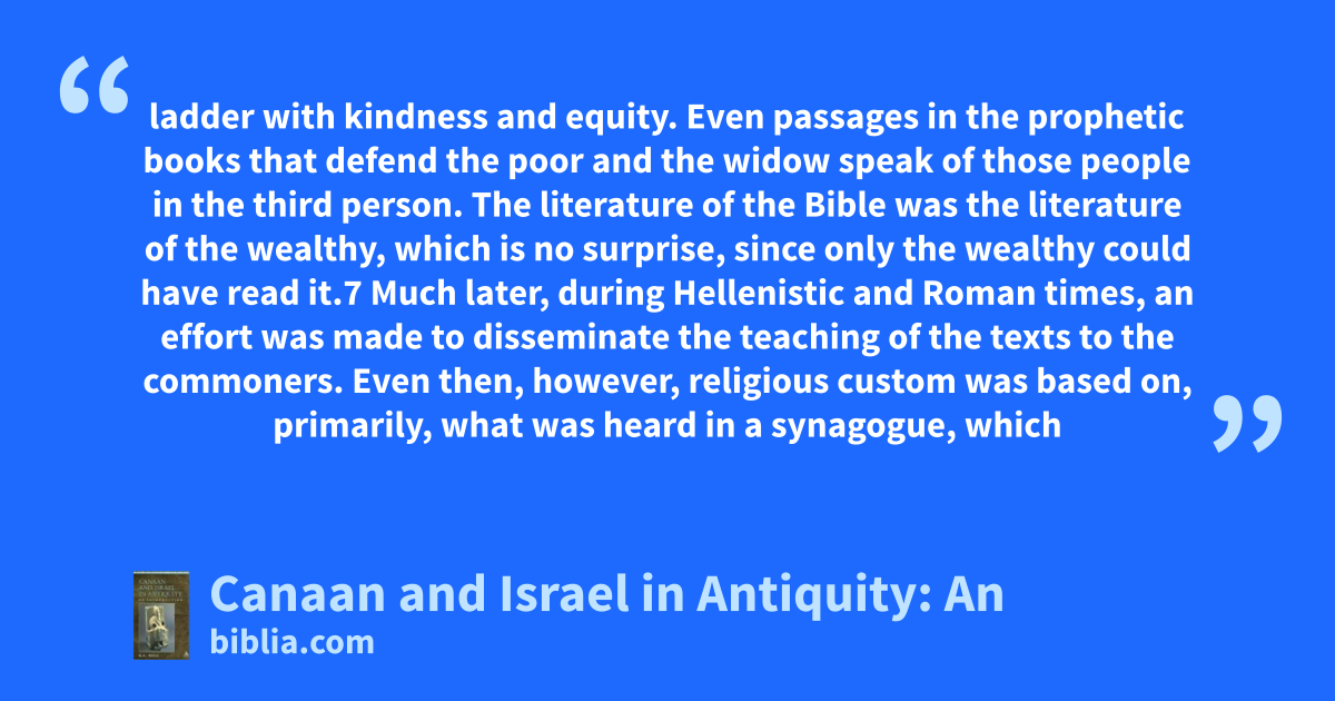 ladder with kindness and equity. Even passages in the prophetic books that defend the poor and the widow speak of those people in the third person. The literature of the Bible was the literature of the wealthy, which is no surprise, since only the wealthy could have read it.7 Much later, during Hellenistic and Roman times, an effort was made to disseminate the teaching of the texts to the commoners. Even then, however, religious custom was based on, primarily, what was heard in a synagogue, which